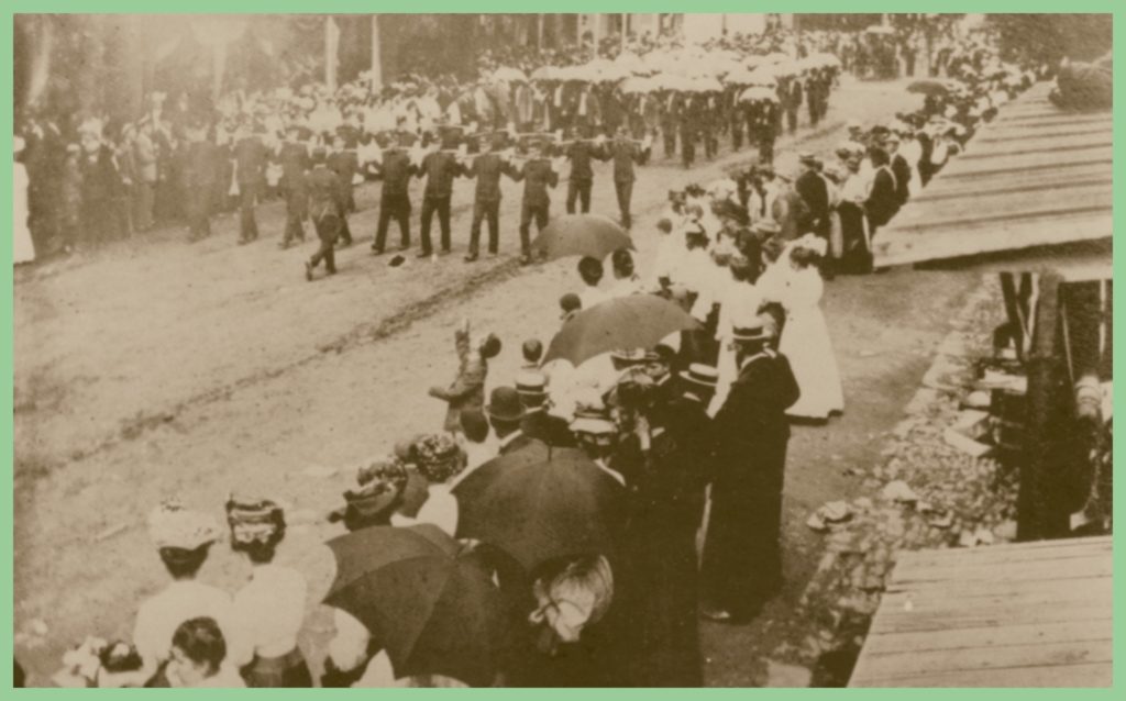 A 1907 photograph of an unidentified band marching in the Millersburg Centennial Parade, Millersburg, Dauphin County, Pennsylvania.
