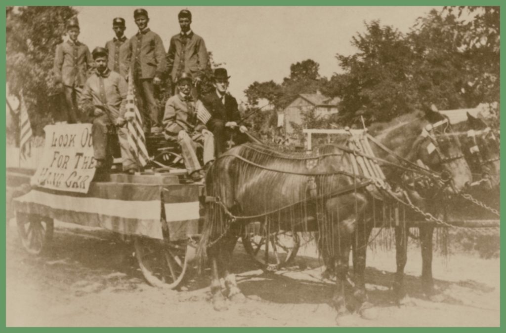 A 1907 photograph of the “Railroad Crew” float in the Millersburg Centennial Parade, Millersburg, Dauphin County, Pennsylvania. The sign on the float reads, “Look Out for the Hand Car.”