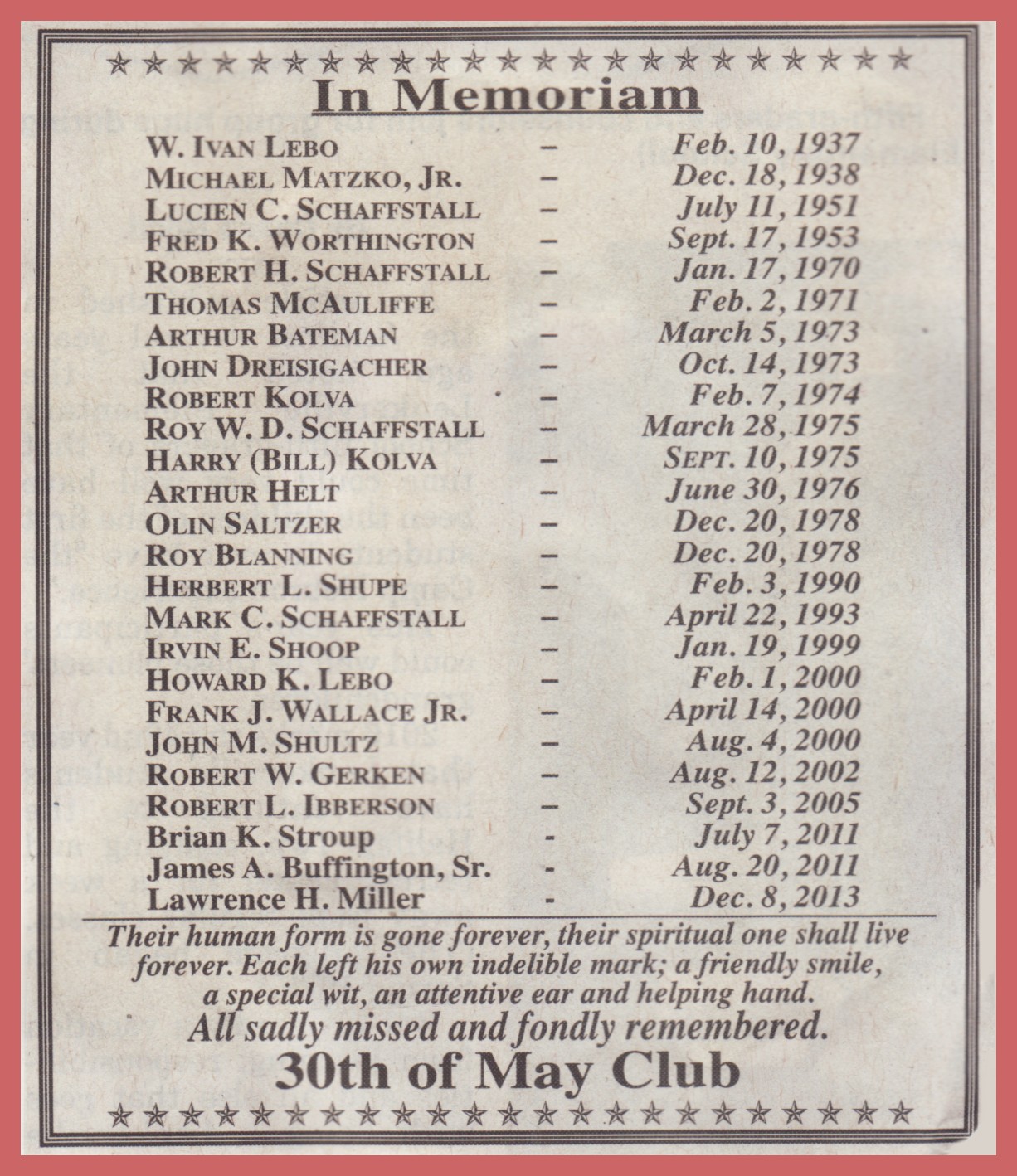 A 2016 “In Memoriam” notice placed in a local newspaper to honor are residents who were members of the “30th of May Club.”