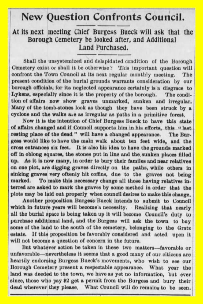 Another proposition Burgess Bueck intends to submit to Council which future years will become a necessity. Realizing that nearly all the burial space is being taken up it will become Council’s duty to purchase additional land, and the Burgess will ask the town to buy some of the land to the south of the cemetery, belonging to the Gratz estate. If this proposition be favorably considered and acted upon it will not become a question of concern in the future.