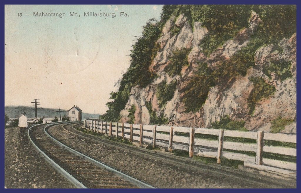 An undated colorized post card version of a C. Noll photograph of the railroad line north of Millersburg, Dauphin County, Pennsylvania, as the tracks curve around the end of the Mahantongo Mountain. The small building left of center in the picture is the Liverpool Railroad Station. The Susquehanna River is to the left of the frame. This photograph, in colorized form, was used on picture post cards representing Millersburg and area.
