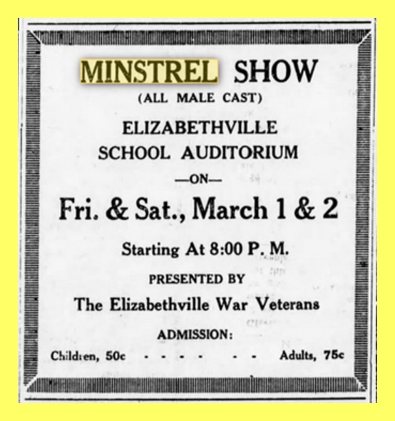 A black-face minstrel show was presented at the Elizabethville School by the V. F. W Post at Elizabethville, Dauphin County, Pennsylvania, February 28, 1957, March 1, 1957, and March 2, 1957. A unique feature of this particular performance was that the February 28 show was presented for children.