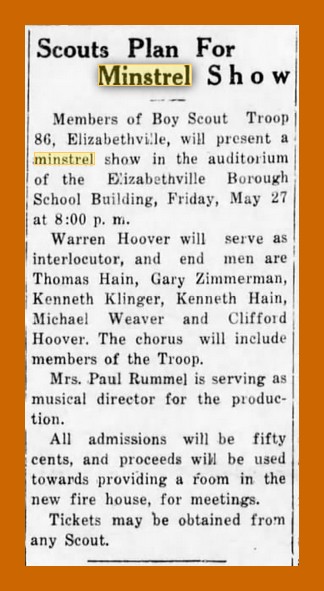 Notice that the Boy Scout Troop 86 of Elizabethville, Dauphin County, Pennsylvania, was presenting a minstrel show was given in article in four successive editions of the Elizabethville Echo, beginning on May 5, 1960;