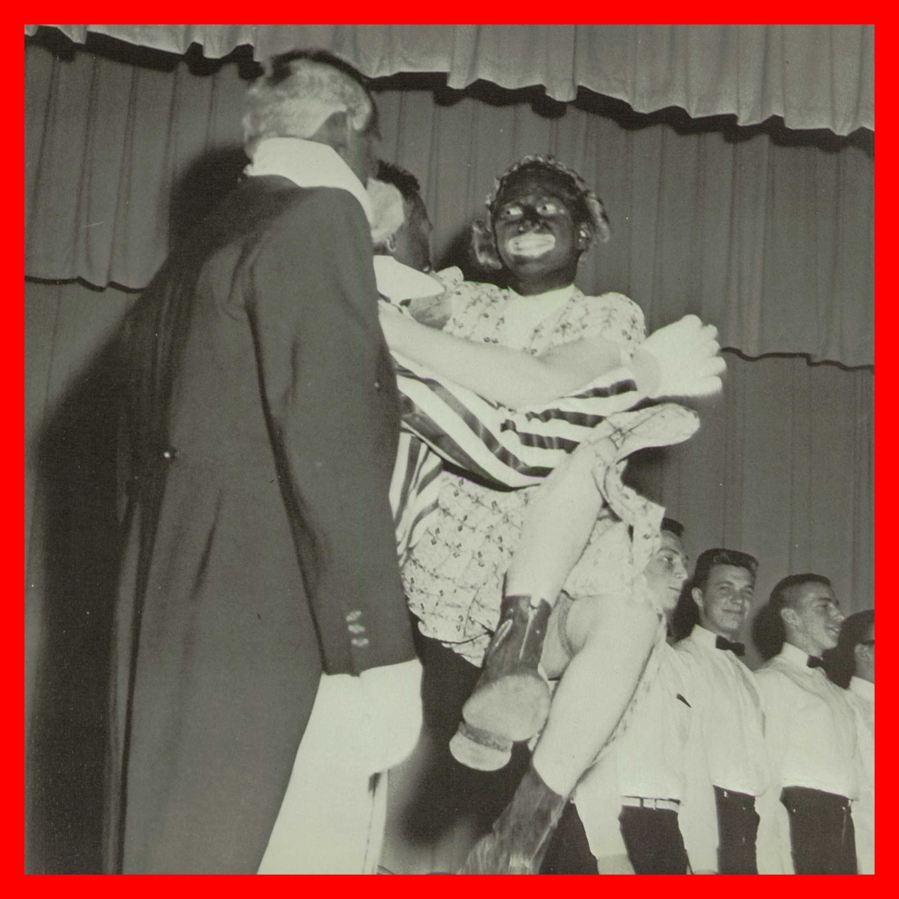 A photograph of a minstrel show held at Our Lady of Lourdes High School, Shamokin, Northumberland County, Pennsylvania, in 1962 The cast was made up of students from the school and several of the students performed in black-face.