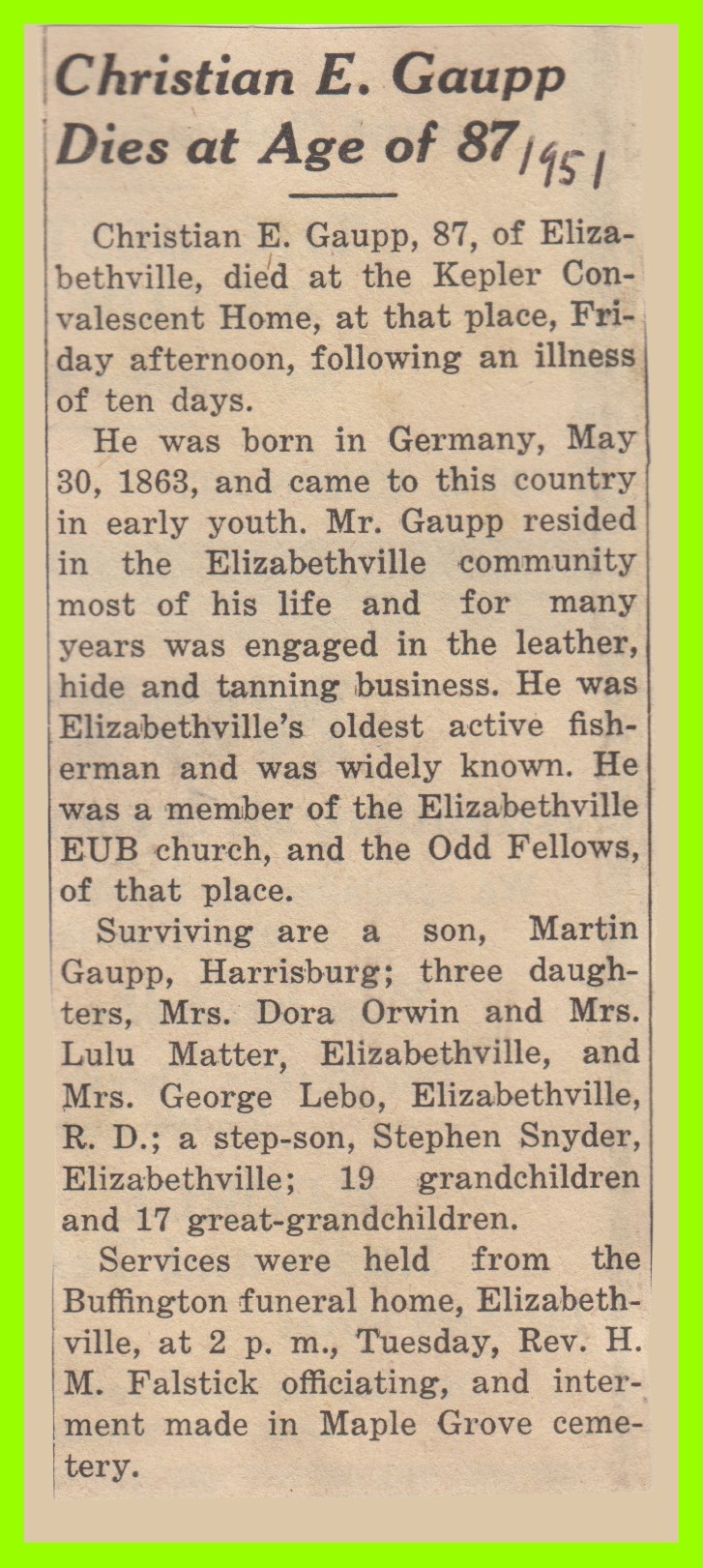 He was born in Germany, 30 May 1863, and came to this country in early youth. Mr. Gaupp resided in the Elizabethville community most of his life and for man years was engaged in the leather, hide and tanning business, He was Elizabethville‘s oldest active fisherman and was widely known. He was a member of the EUB church and the Odd Fellow of that ace.