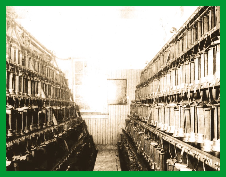 A photograph taken about 1900 of miners’ safety lamps hanging on numbered pins in a colliery lamp and check off house.