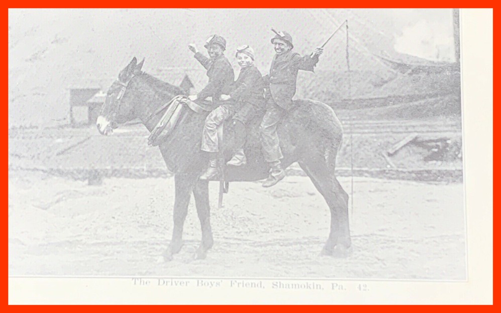 An undated photo post card view of three boys workers on a mule outside a mine near Shamokin, Northumberland County, Pennsylvania.