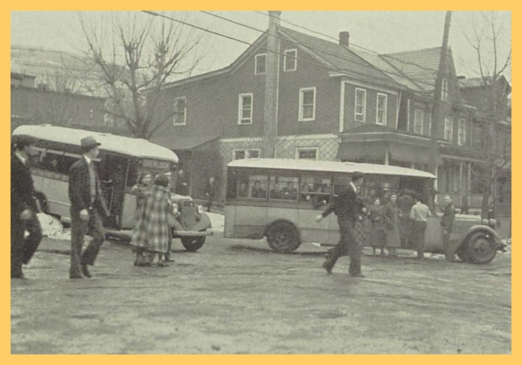 A 1936 photograph of students boarding school buses to ride home from Coal Township High School, Shamokin, Northumberland County, Pennsylvania.