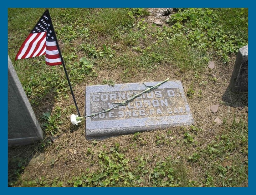 During the Civil War, Cornelius D. Waldron served as a Corporal in the 9th Pennsylvania Cavalry, Company K. He enrolled at Halifax, Dauphin County, Pennsylvania, on 9 September 1861, and was mustered into service at Harrisburg on 29 October 1861. At the time he was 26 years old, stood 5 foot 8 inches tall, had light hair, a light complexion, and light eyes. He claimed to be born in Dauphin County and gave his occupation as postmaster. On 24 December 1864, upon completion of his term of service, he was discharged, as he chose not to re-enlist.