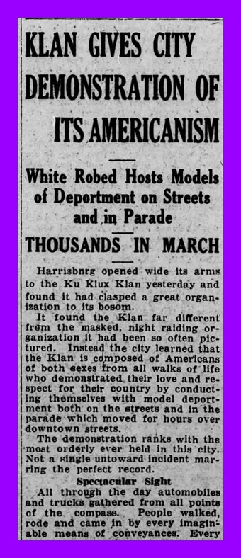 On Labor Day weekend 1925, the Ku Klux Klan of Dauphin County, Pennsylvania, held a huge demonstration in Harrisburg, the county seat and capital city of the state. Large crowds arrived to participate and witness as thousands of white-robed Klansmen and Klanswomen paraded in full regalia.