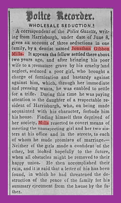 A correspondent of the Police Gazette, writing from Harrisburgh, under the date of June 8, gives an account of three seductions in one family, by a dentist named Jonathan Gibbon Mills.  It appears that the fellow settled there about two years ago, and after bringing his poor wife to a premature grave by his cruelty and neglect, seduced a poor girl, who brought a charge of fornication and bastardy against him, which, through her immediate and pressing wants, he was enabled to settle for a trifle. Daring this time he was paying attention to the daughter of a respectable resident of Harrisburgh, who, on being made acquainted with his character, forbade him from his house.  Finding himself thus deprived of her society, Mills resorted to covert means of meeting the unsuspecting girl and her two sisters at his office and in the streets, to each of whom he made promises of marriage. — Neither of the girls made a confident [sic] of the other, but looked hopefully to the future, when all obstacles might be removed to their happy union.  He then accomplished their ruin, and it is said that a letter of his has been found, in which he had threatened the destruction of the peace of the family for his summary ejectment from the house by the father.