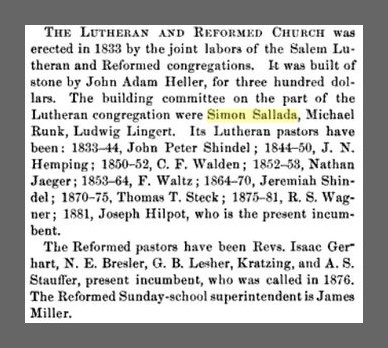 The building committee on the part of the Lutheran congregation were Simon Sallada, Michael Runk, Ludwig Lingert.