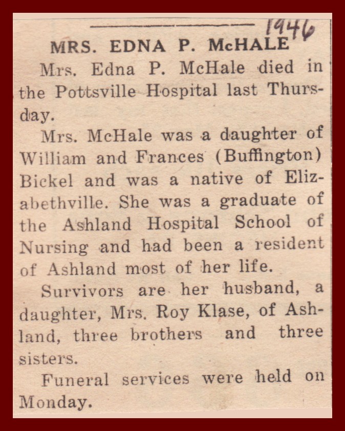 Mrs. McHale was a daughter of William Bickel and Frances [Buffington] Bickel and was a native of Elizabethville. She was a graduate of the Ashland Hospital School of Nursing and had been a resident of Ashland most of her life.