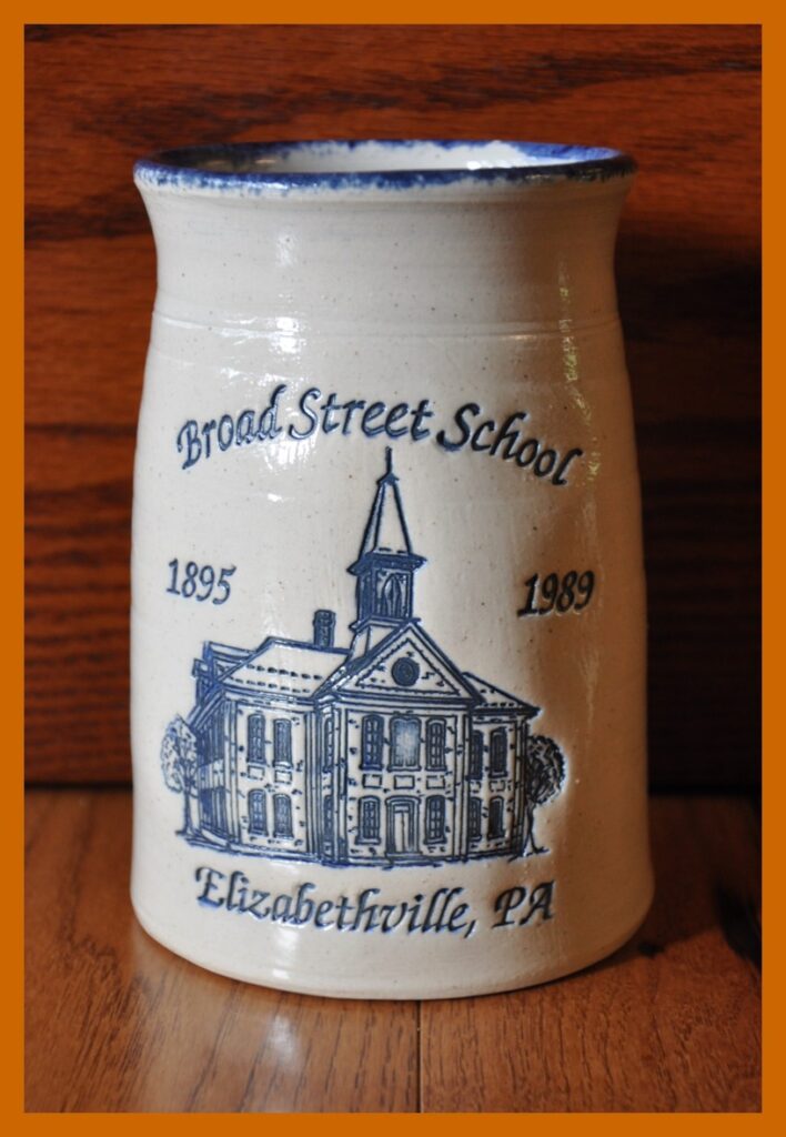 A souvenir crock depicting the Broad Street School, Elizabethville, Dauphin County, Pennsylvania.