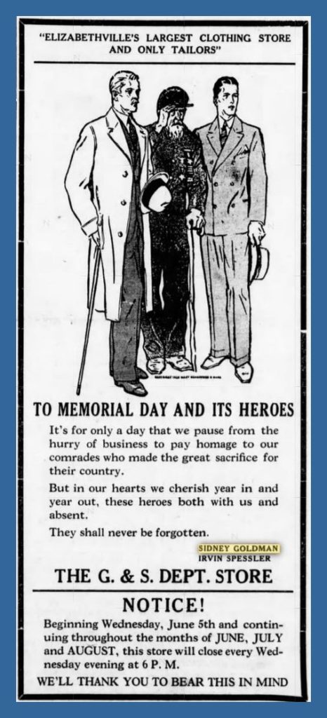 This ad appeared in the Elizabethville Echo, 30 May 1929. It pictures three men, two in business or street clothing standing arm in arm with a Civil War veteran in a G.A.R. uniform. The advertisers, Sidney Goldman (1893-1965) and Irvin Spessler, were the owner/operators of the G. & S. Department Store of Elizabethville, Dauphin County, Pennsylvania, that advertised itself as “Elizabethville‘s largest clothing store and only tailors.” Men of the G.A.R. wore a standard uniform which was sold and fitted at the G. & S. Department Store.