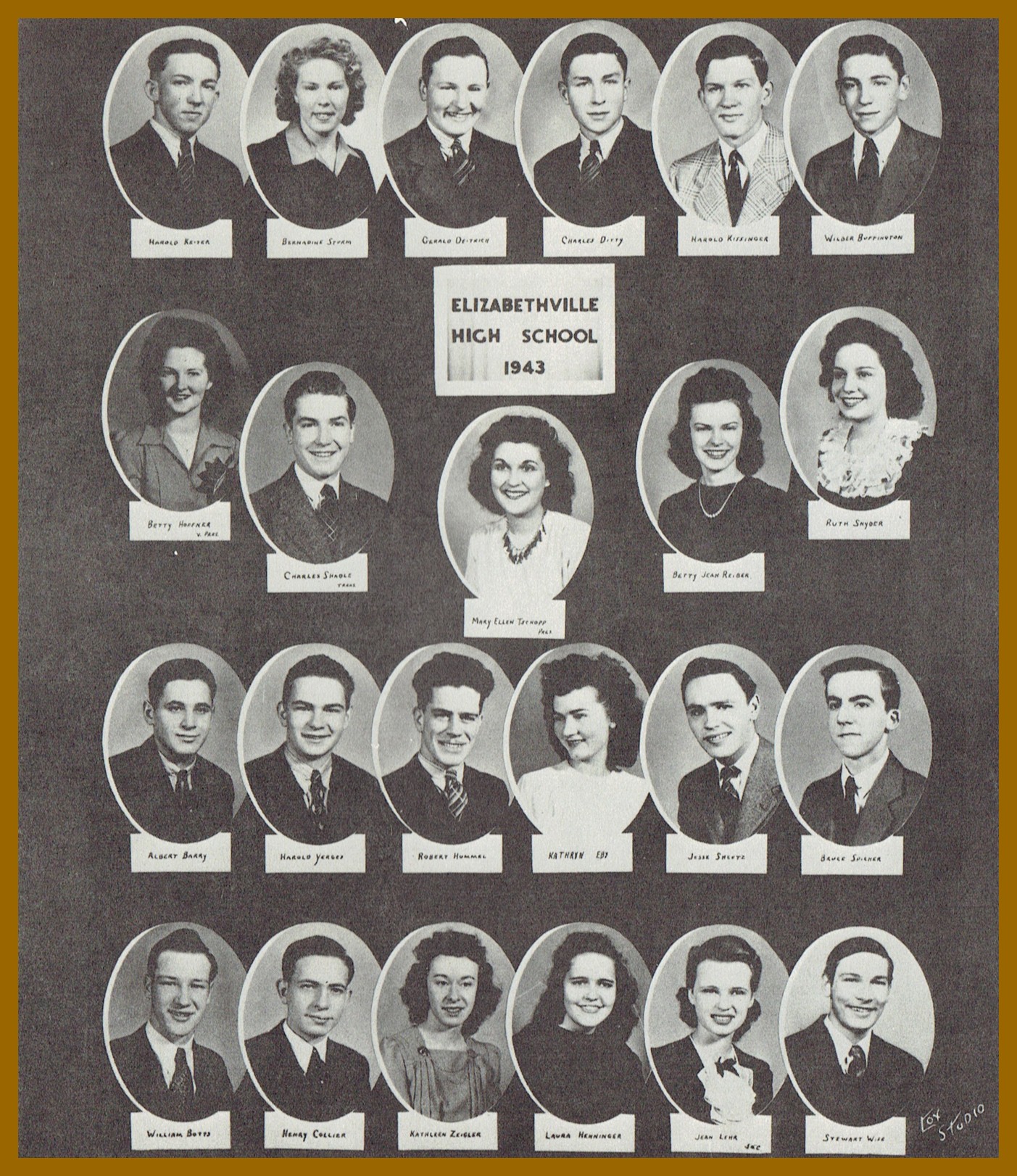 A composite of individual photos of the members of the Class of 1943 from School Days: Graduates of Elizabethville High School, 1895-1954, by Miles V. Miller, which was published on 18 June 1984.