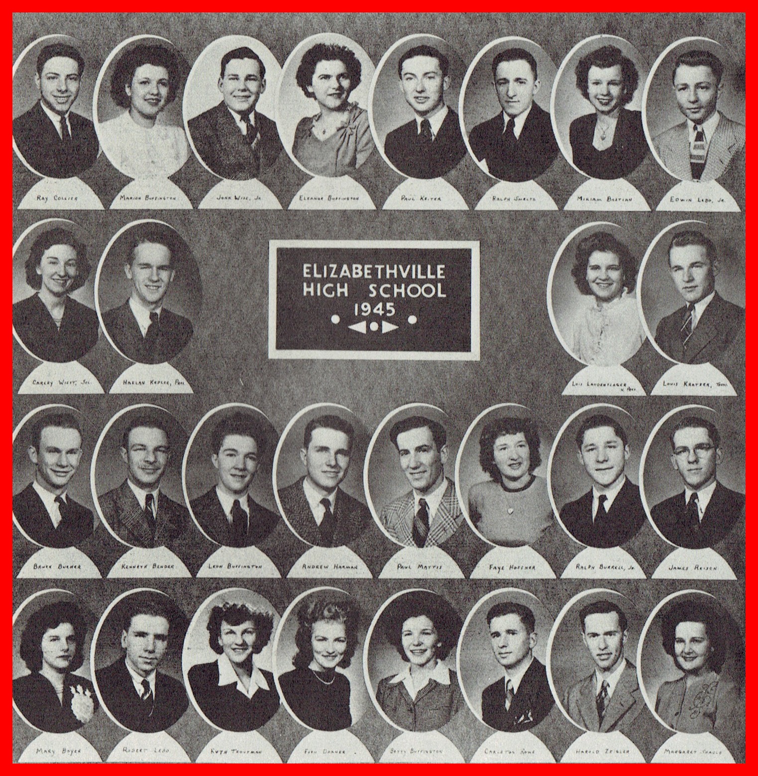 A composite of individual photos of the members of the Class of 1945 from School Days: Graduates of Elizabethville High School, 1895-1954, by Miles V. Miller, which was published on 18 June 1984.