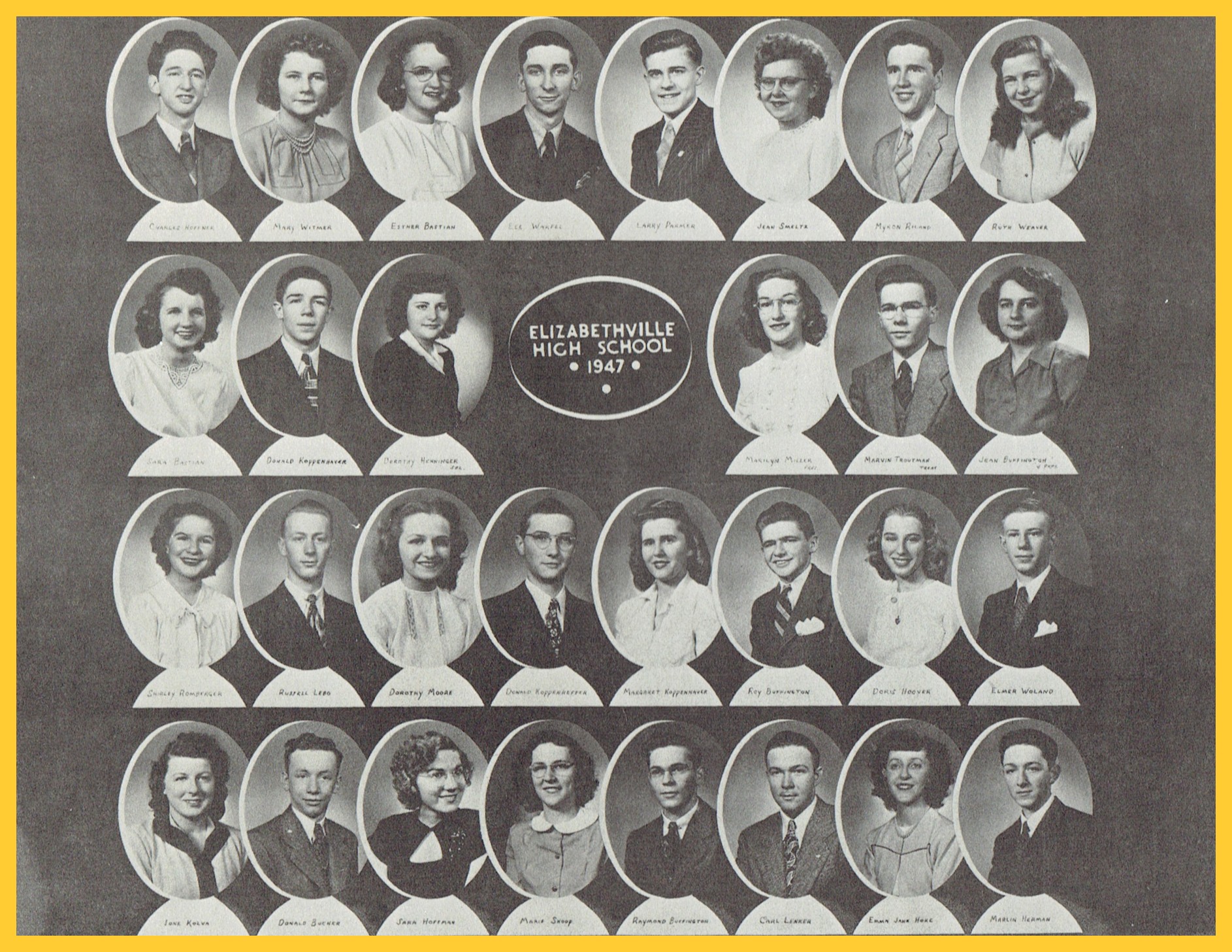 A composite of individual photos of the members of the Class of 1947 from School Days: Graduates of Elizabethville High School, 1895-1954, by Miles V. Miller, which was published on 18 June 1984.