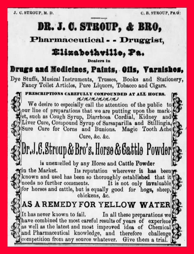 Dr. J. C. Stropup & Bro’s Horse and Cattle Powder in unexcelled by any Horse and Cattle Powder in the Market. Its reputation wherever it has been known and used has been so thoroughly established that it needs no further comments. It is not only invaluable for horses and cattle, but is equally good for hogs, sheep, chickens, &c.