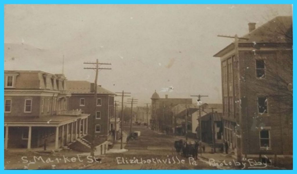 An undated photo post card view of South Market Street, Elizabethville, Dauphin County, Pennsylvania. The building in the center with the dome, is the Lykens Valley Bank. The railroad track of the Lykens Valley Railroad, crossed Market Street, although not discernable in the photo.