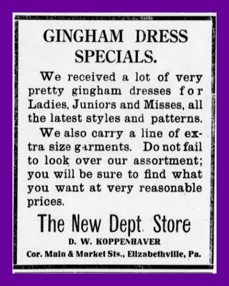 We received a lot of very pretty gingham dresses for Ladies, Juniors and Misses, all the latest styles and patterns.