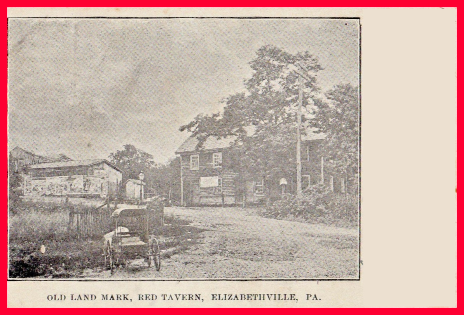 An undated post card featuring an old print of the Red Tavern Landmark, Elizabethville, Dauphin County, Pennsylvania.
