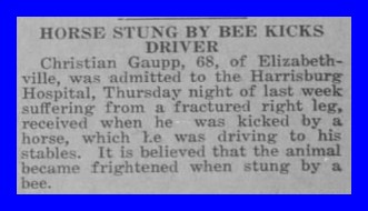 Christian Gaupp, 68, of Elizabethville, was admitted to the Harrisburg Hospital, Thursday night of last week suffering from a fractured right leg, received when he was kicked by a horse, which he was driving to his stables. It is believed that the animal became frightened when stung by a bee.