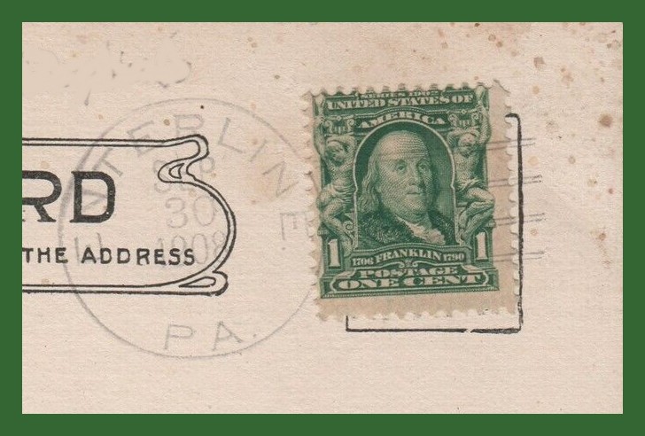 The stamped corner of a penny post card mailed from the Enterline Post Office, Enterline, Dauphin County, Pennsylvania, September 30, 1908.