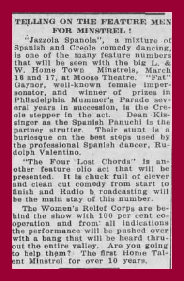 “Jazzola Spanola,” a mixture of Spanish and Creole comedy dancing is one of the many feature numbers that will be seen with the big L. & W. Home Town Minstrels, March 16 and 17 [1925] at Moose Theatre. “Fat” Gaynor, well-known female impersonator, and winner of prizes in Philadelphia Mummer’s Parade several years in succession, is the Creole stepper in the act. Dean Kissinger as the Spanish Panuchi is the partner strutter. Their stunt is a burlesque on the best steps used by the professional Spanish dancer, Rudolph Valentino.