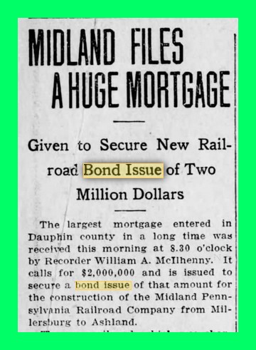 Midland Pennsylvania Railroad – “Plans to underwrite the bonds to be issued against the $2,000,000 mortgage filed by the Midland Pennsylvania Railroad, have about been completed and in a short time the work of construction will be begun. Only a few details have yet to be worked out. The new road which is owned largely by Philadelphians will extend from Ashland to Millersburg and it is said that the bonds may be put on the market after the work of construction is started, without waiting for its completion.
