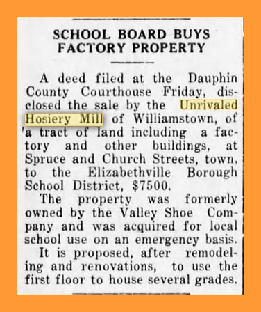 A brief article appearing in the Elizabethville Echo, July 16, 1953, told of the sale of the former Unrivaled Hosiery Mill to the Elizabethville Borough School District and the intention to convert the building into a school.