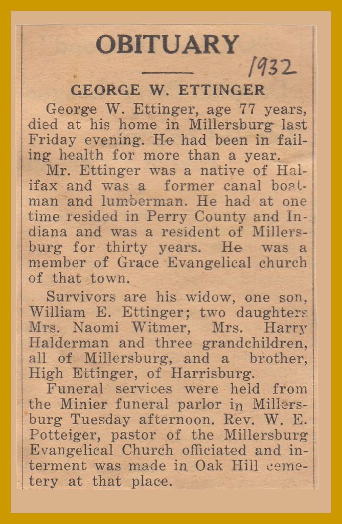 Mr. Ettinger was a native of Halifax and was a former canal boatman and lumberman. He had at one time resided in Perry County and Indiana and was a resident of Millersburg for thirty years. He was a member of Grace Evangelical Church of that town.