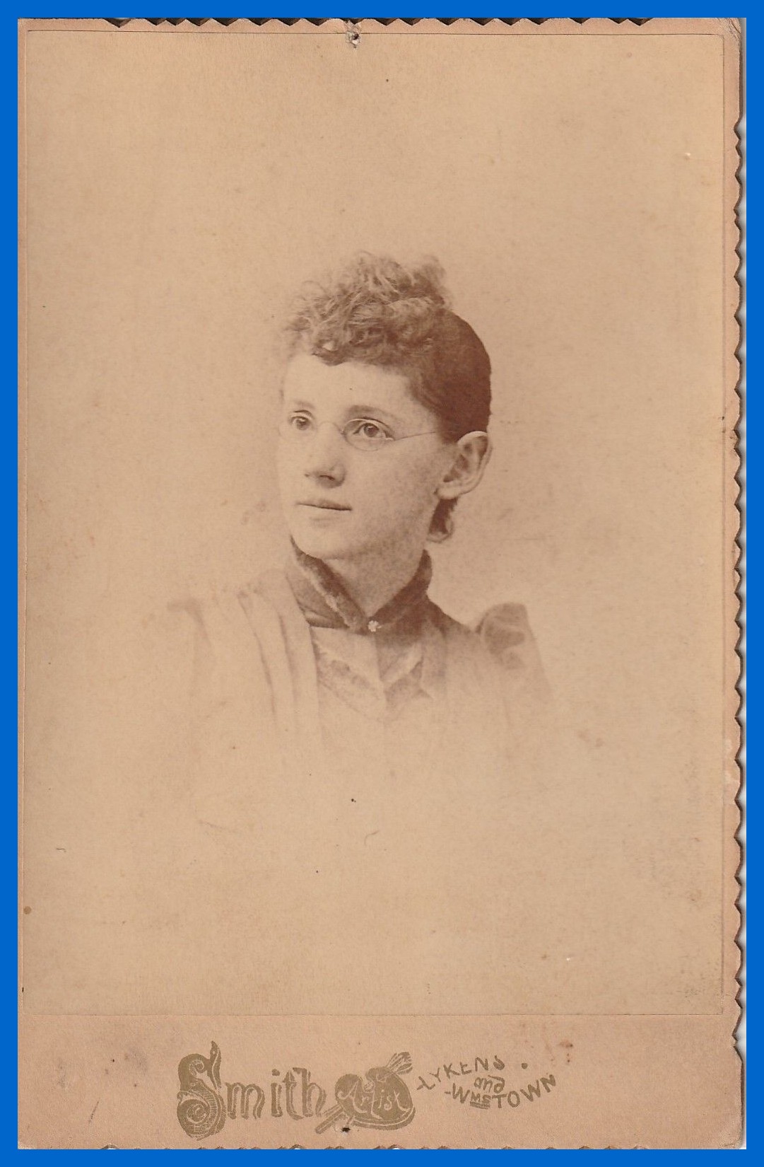 An undated studio cabinet card photograph identified as Gertie Miller. The photo was taken at the W. W. Smith Photography Studio in either Lykens or Williamstown, Dauphin County, Pennsylvania.