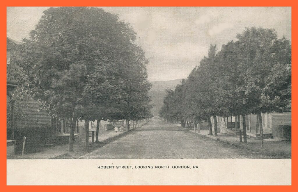 An undated photo post card image of Hobert Street, looking north, Gordon, Schuylkill County, Pennsylvania.