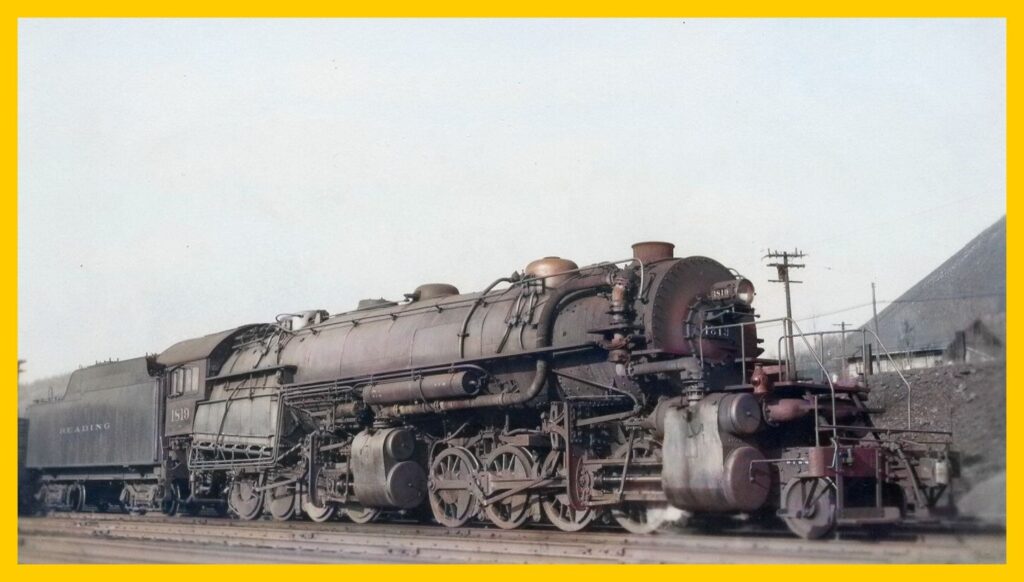 An undated, colorized photograph of Reading Railroad Locomotive #1819 at the company yards at Gordon, Schuylkill County, Pennsylvania.