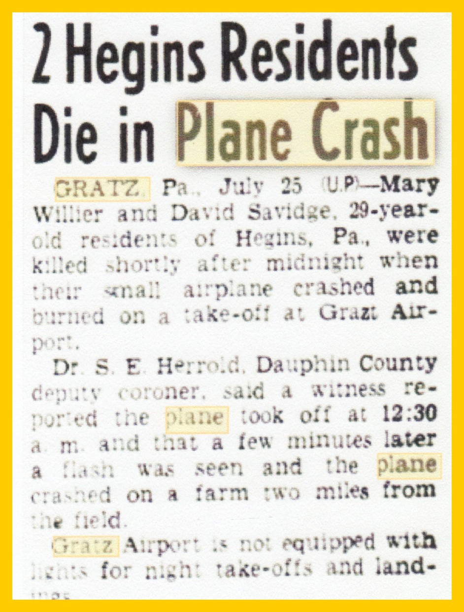 GRATZ, Pennsylvania, 25 July [1947] — Mary Willier and David Savidge, 29-year old residents of Hegins, Pennsylvania, were killed shortly after midnight when their small airplane crashed and burned on a take-off at Gratz Airport.