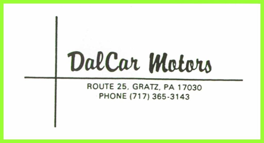 A 1987 advertisement for DalCar Motors, Route 25, Gratz, Dauphin County, Pennsylvania.