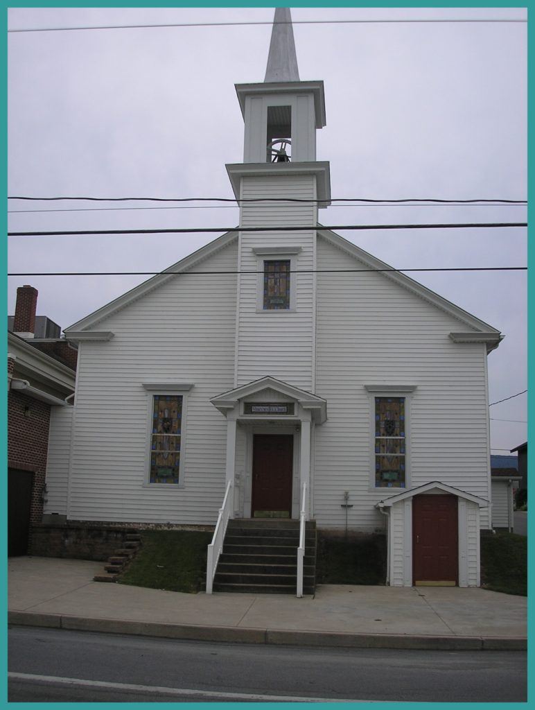 A photograph taken in August 2010 of the from of the old Evangelical Congregational Church on West Market Street, Gratz, Dauphin County, Pennsylvania. The exterior of the church building has been preserved in its original appearance, but the interior has been completely remodeled by its owner, the Gratz National Bank, for use as corporate offices.