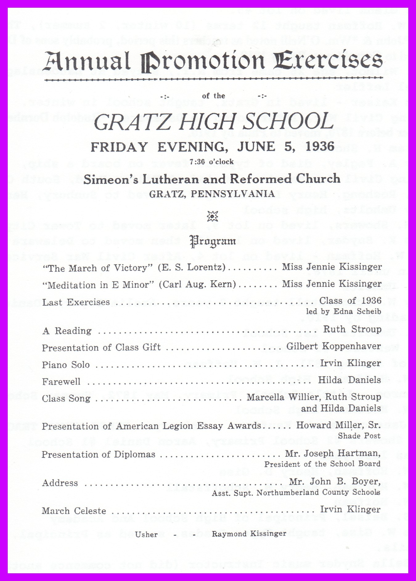 The Annual Promotion Exercises of the Gratz High School were held at Simeon’s Lutheran and Reformed Church, Gratz, Dauphin County, Pennsylvania, Friday evening, 5 June 1936, at 7:30 o’clock.