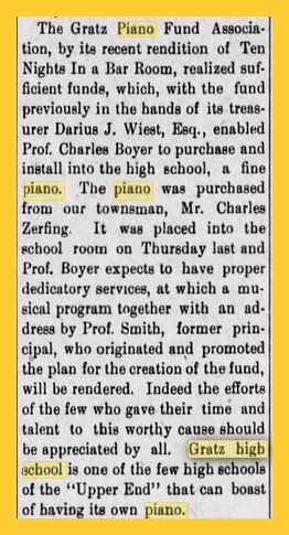 The Gratz Piano Fund Association, by its recent rendition of Ten Nights in a Bar Room, realized sufficient funds, which, with the fund previously in the hands of its treasurer, Darius J. Wiest, Esq., enabled Prof. Charles Boyer to purchase and install into the high school, a fine piano. The piano was purchased from our townsman, Mr. Charles Zerfing. It was placed into the school room on Thursday last and Prof. Boyer expects to have proper dedicatory services, at which a musical program together with an address by Prof. Smith, former principal, who originated and promoted the plan for the creation of the fund will be rendered. Indeed the efforts of the few who gave their time and talent to this worthy cause should be appreciated by all. Gratz High School is one of the few high schools of the “Upper End” that can boast of having its own piano.