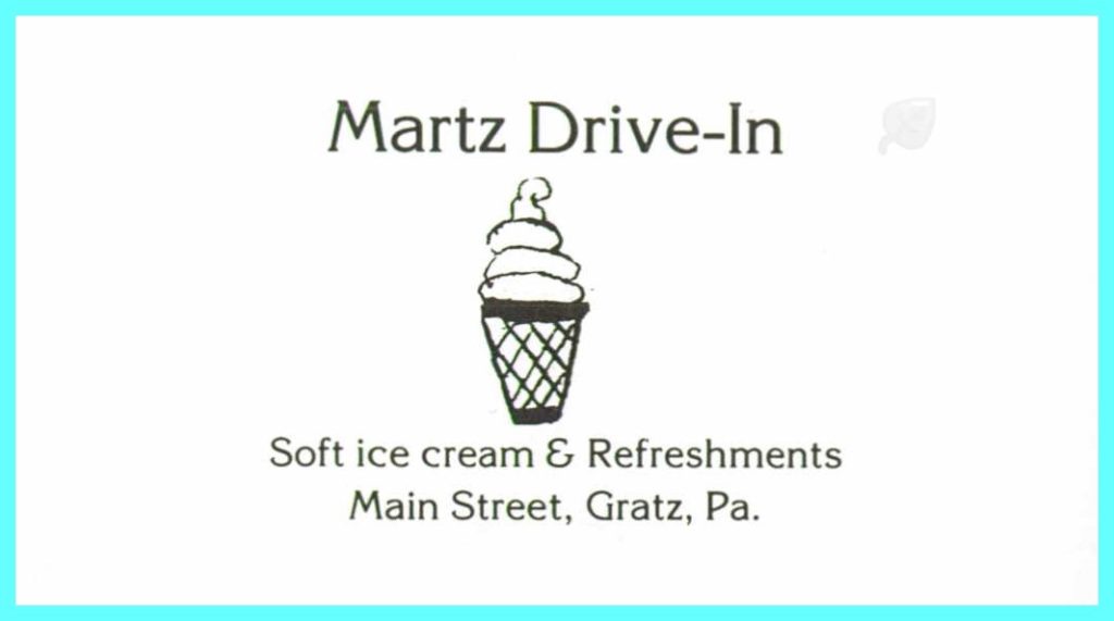 A 1987 advertisement for the Martz Drive-In, Main Street, Gratz, Dauphin County, Pennsylvania.