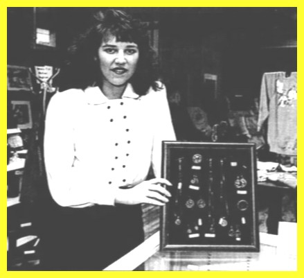 A newspaper photograph from October 1990 of Lori Schoffstall, owner-operator of Peddler’s Junction, a craft store at 8 East Market Street in Gratz, Dauphin County, Pennsylvania. The business was established about the time the photo was taken. At first the store sold locally made crafts but later became an outlet for antiques and other collectibles. The property was sold in 1996 and the new owners operated an antique and craft business here for several years. Later the space became a child day care center.