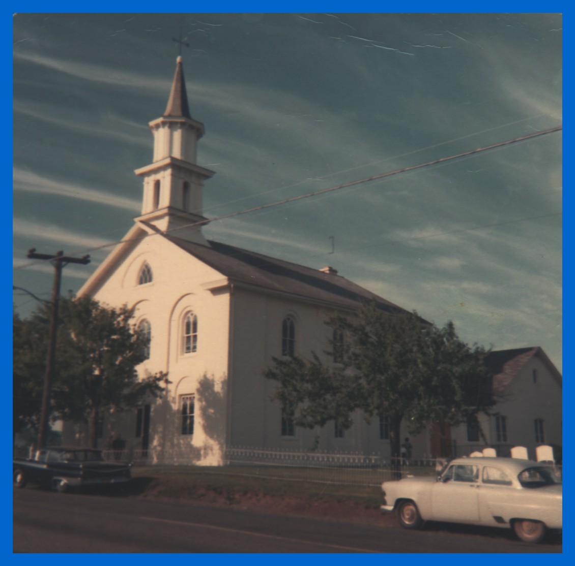 A snapshot photograph of Simeon Lutheran and Reformed Church, Gratz, Dauphin County, Pennsylvania, believed to have been taken in September 1966. At the time, the building was covered in a white stucco finish which was later removed to reveal the original red brick finish.