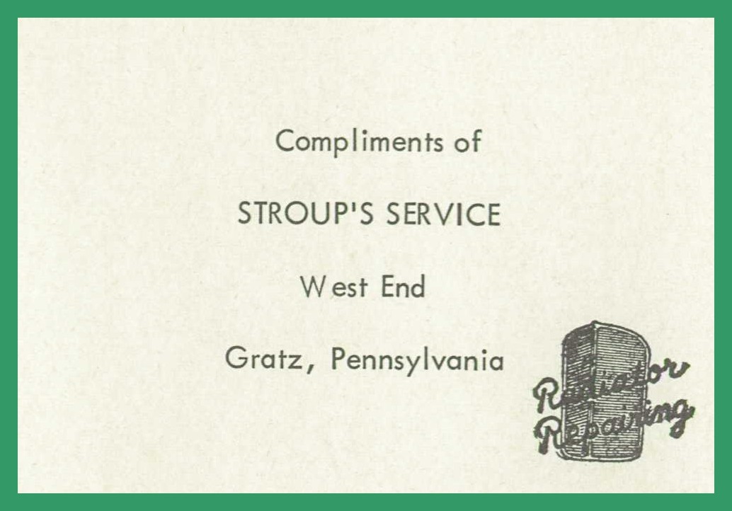 A 1954 advertisement for Stroup’s West End Service, Gratz, Dauphin County, Pennsylvania.