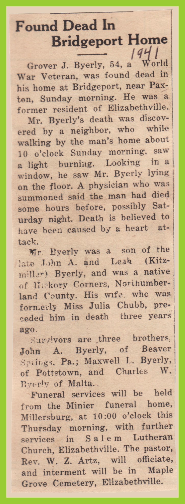 Mr. Byerly’s death was discovered by a neighbor, who while walking by the man’s home about 10 o’clock Sunday morning, saw a light burning. Looking in a window, he saw Mr. Byerly lying on the floor. A physician who was summoned said the man had died some hours before, possibly Saturday night. Death is believed to have been caused by a heart attack.