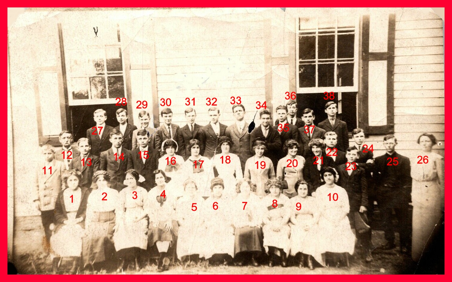 Only one student in the photo has been identified, Melvin Sheetz, who appears in the second row, fifth from left, or #15 in the key below.