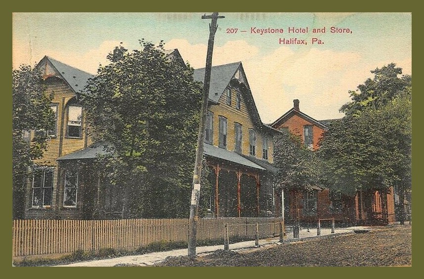An undated colorized view from a picture post card of the Keystone Hotel and Store at Halifax, Dauphin County, Pennsylvania.