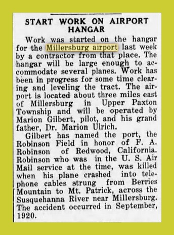 Work was started on the hangar for the Millersburg Airport last week by a contractor from that place. The hangar will be large enough to accommodate several planes. Work has been in progress for some time clearing and leveling the tract. The airport is located about three miles east of Millersburg in Upper Paxton Township and will be operated by Marion Gilbert, pilot, and his grandfather, Dr. Marion Ulrich.