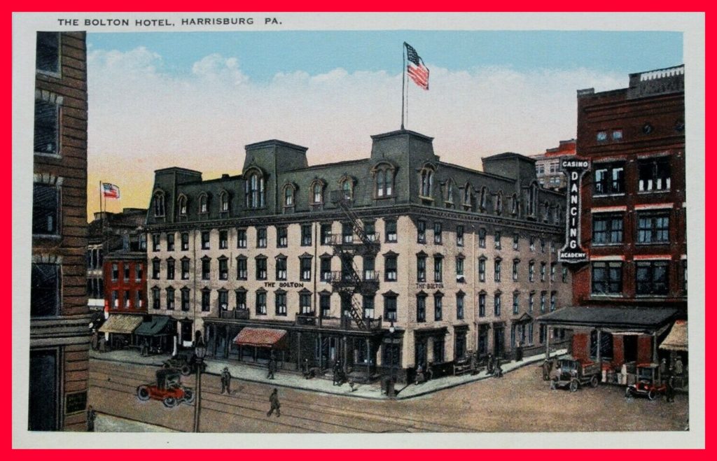 An undated colorized photo post card view of the Bolton Hotel, Harrisburg, Dauphin County, Pennsylvania.