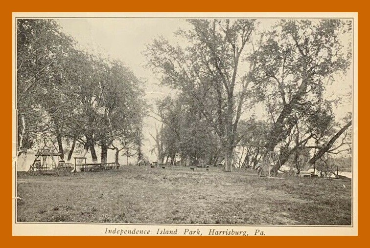 An undated photo post card view of playground equipment at Independence Island Park, Harrisburg, Dauphin County, Pennsylvania.